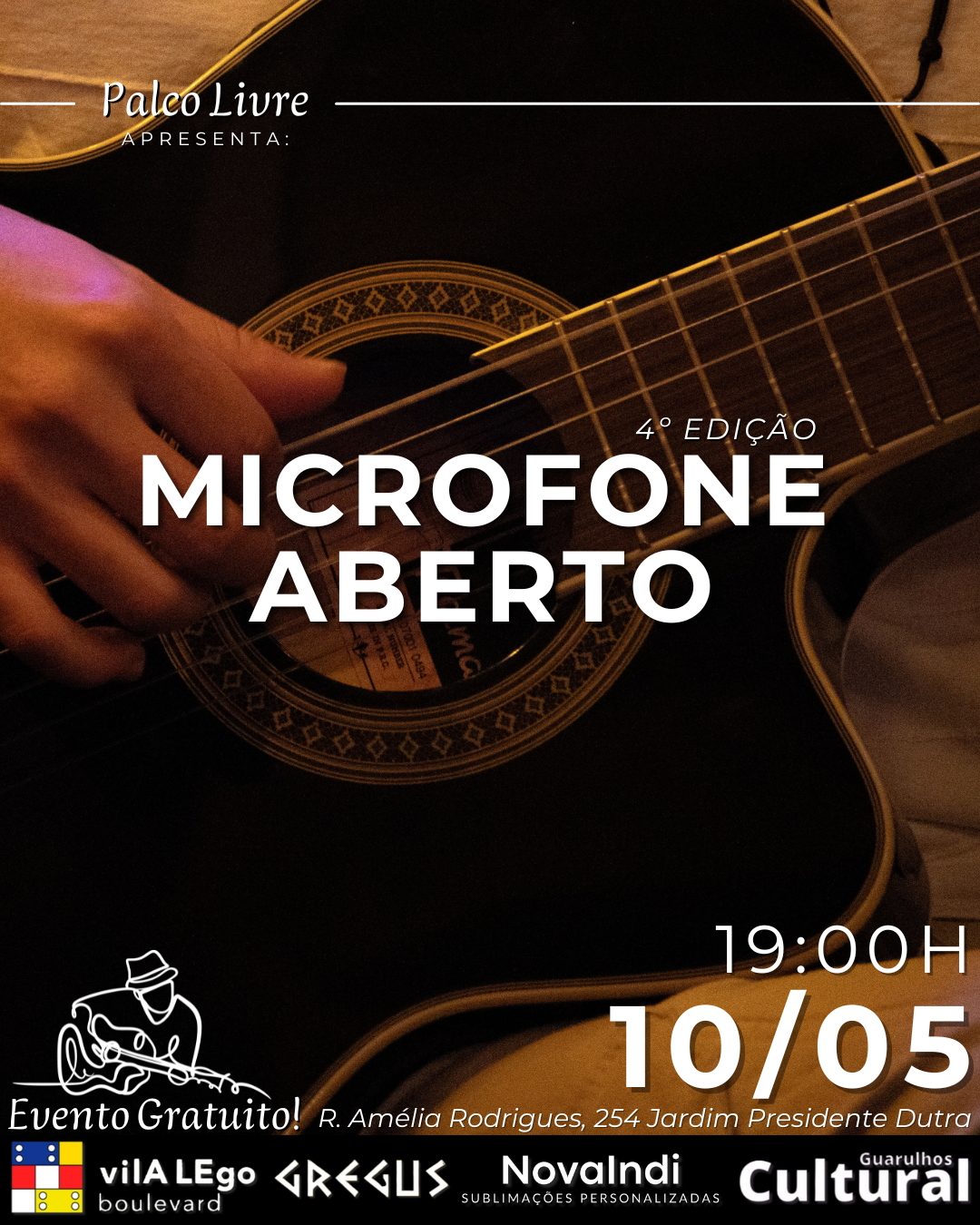 No dia 10 de maio, sábado, a partir das 19h, acontece nova edição do Microfone Aberto, no Vila Lego Boulevard, no Jardim Presidente Dutra. O evento integra o projeto Palco Livre, e tem como objetivo abranger e integrar artistas da música e poetas, escritores, fotógrafos, entre outros. A entrada é gratuita.