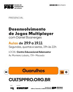 Já os interessados no universo digital podem se inscrever no curso “Desenvolvimento de Jogos Multiplayer”, que acontece de 29 de setembro a 19 de novembro, às segundas, quartas e sextas, das 19h às 22h, no Centro Educacional Adamastor (Av. Monteiro Lobato, 734 – Macedo).
