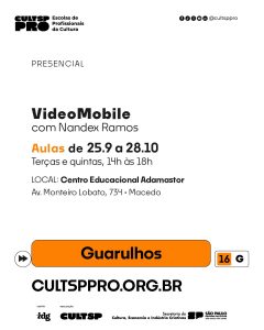 Também no Adamastor acontece o curso “VideoMobile”, com o professor Nandex Ramos, de 25 de setembro a 28 de outubro, sempre às terças e quintas, das 14h às 18h.