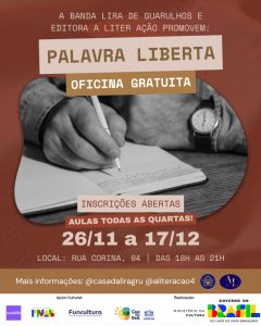 A Casa da Lira, em parceria com a Editora A Liter Ação, anuncia a abertura das inscrições para a oficina literária “Palavra Liberta”, atividade formativa gratuita que propõe uma nova forma de compreender e praticar a criação textual. A iniciativa conta com apoio da Política Nacional Aldir Blanc (PNAB) e do Funcultura, reforçando o compromisso das instituições com a democratização do acesso à formação cultural na cidade.